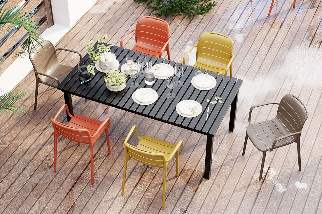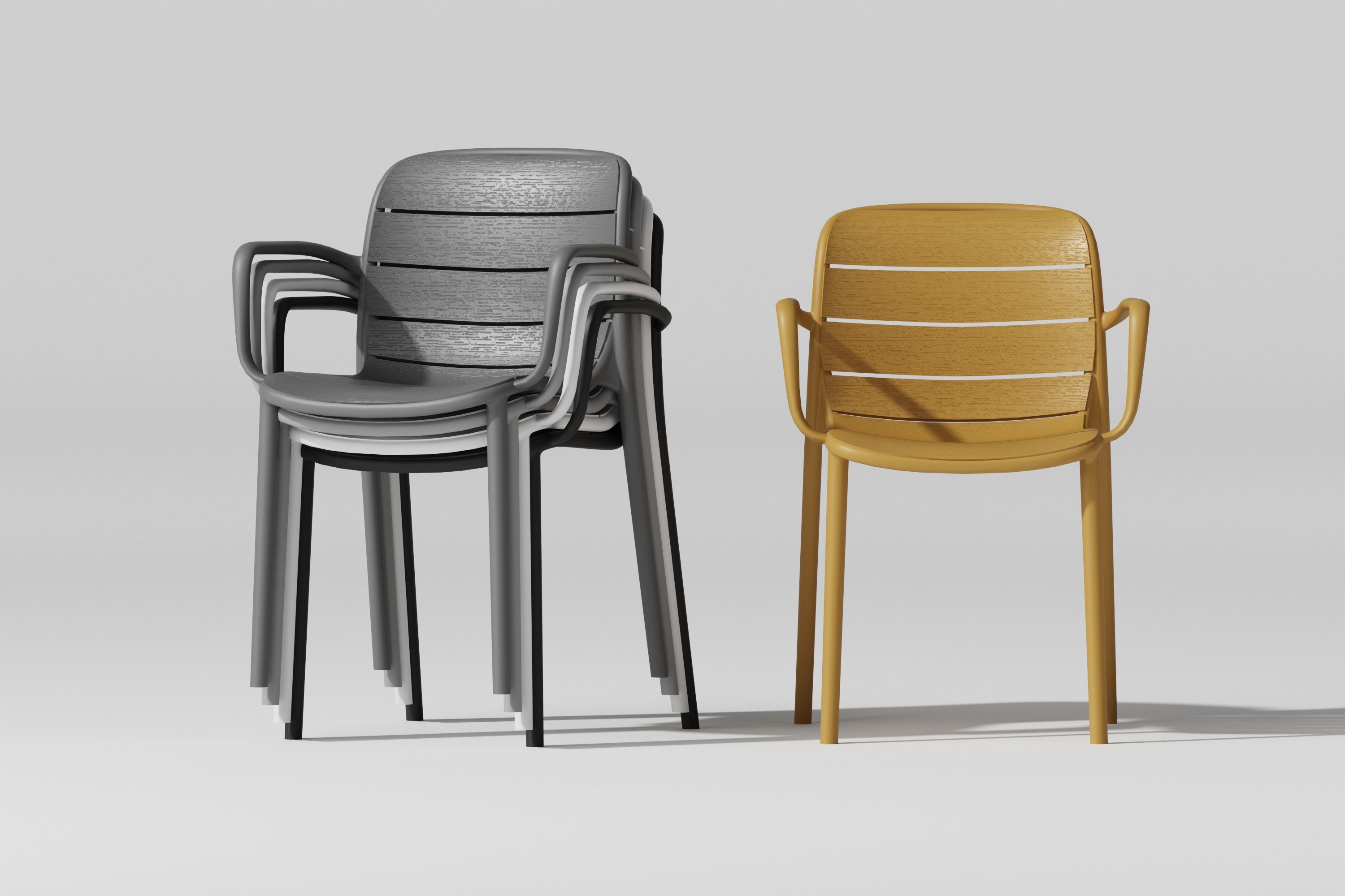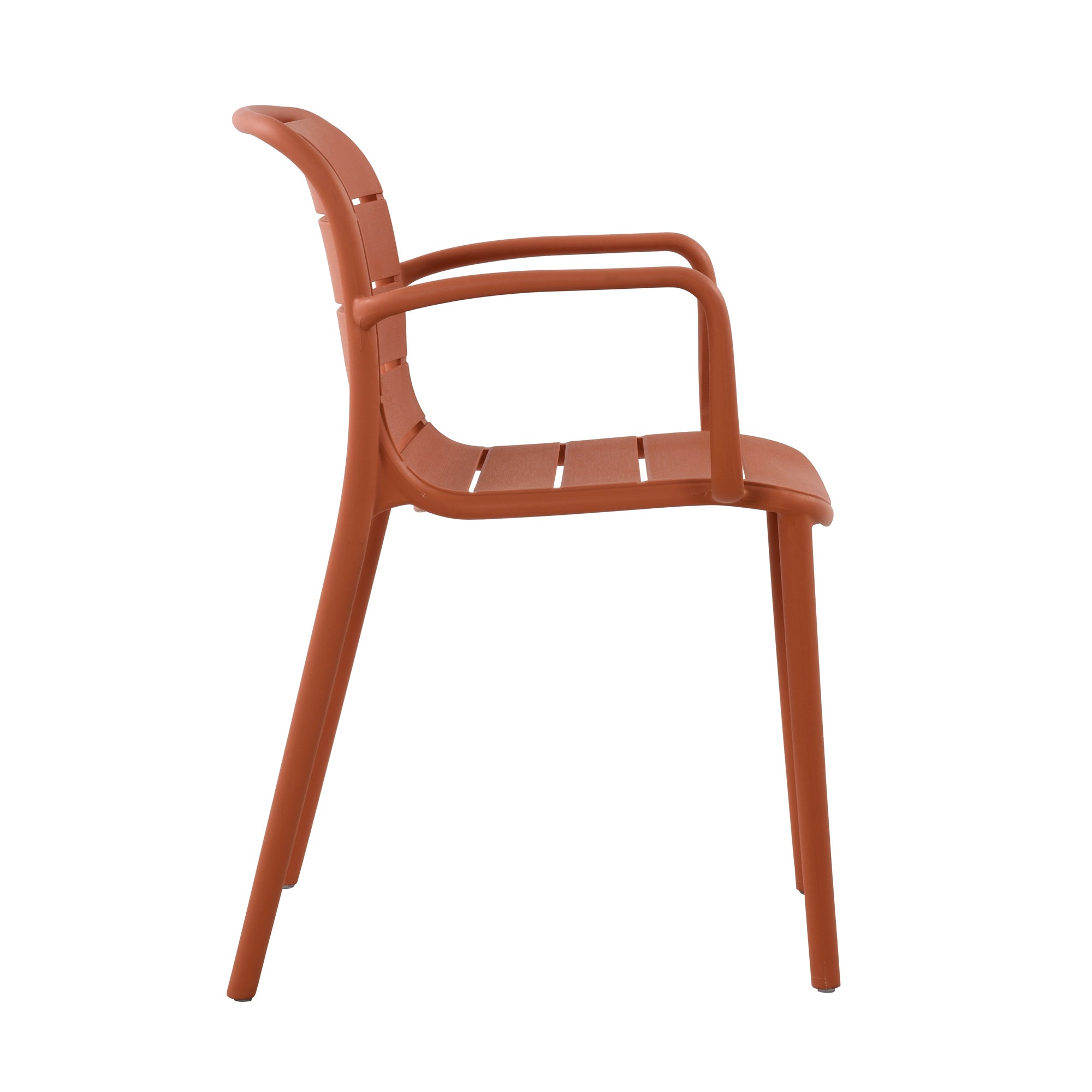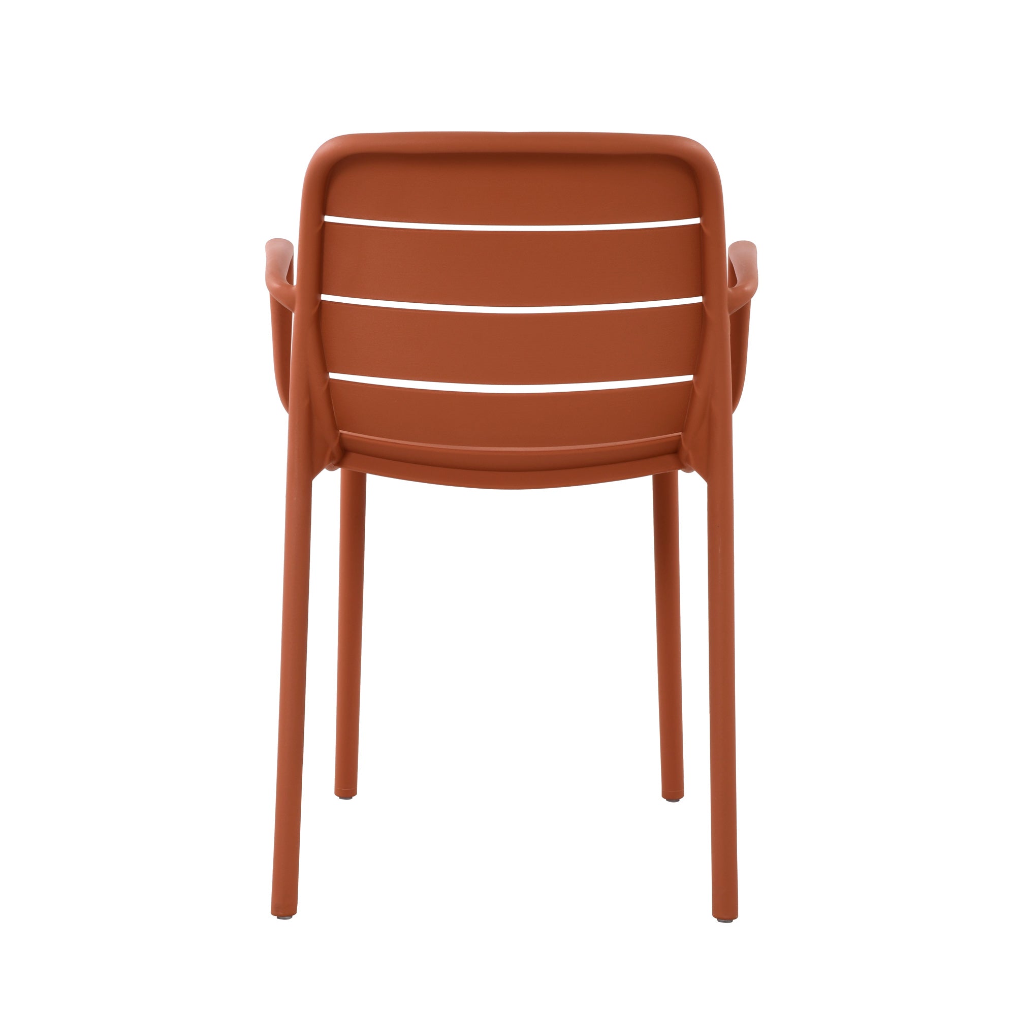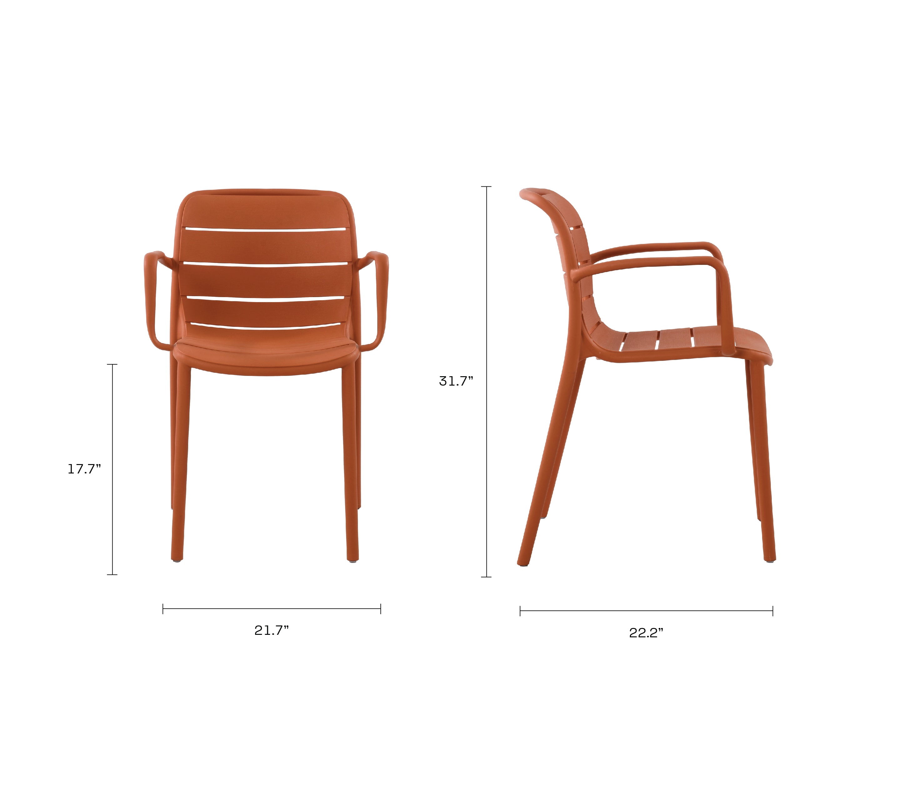 It features a sleek, modern design with a stackable structure, offering convenience and space-saving storage when not in use. Delivered fully assembled, the Emily Arm Chair and Emily Side Chair are ready to use straight out of the box, making them a hassle-free choice for patios, dining areas, or events. Available in a range of vibrant colors, these chairs effortlessly combine practicality with a touch of contemporary elegance.
