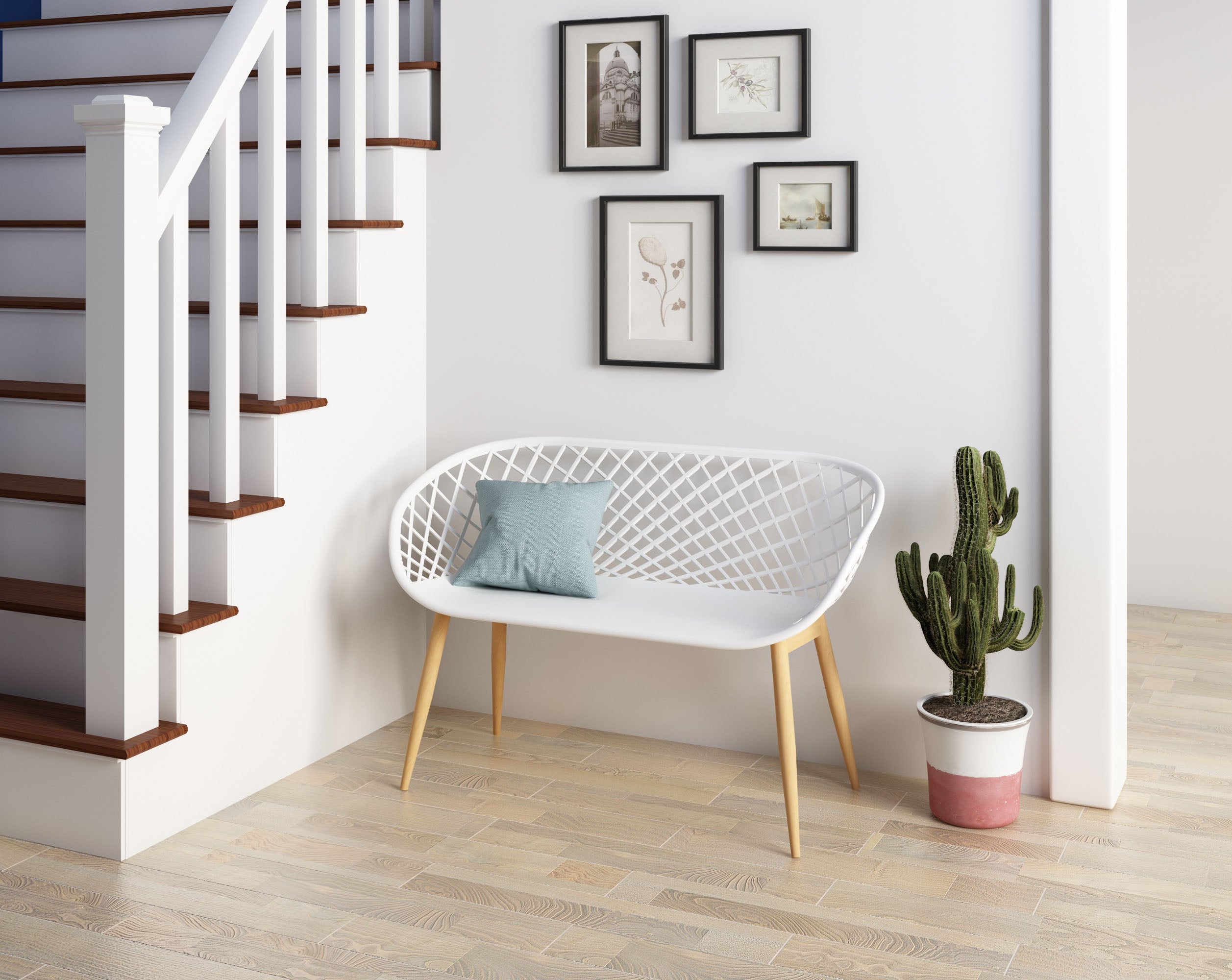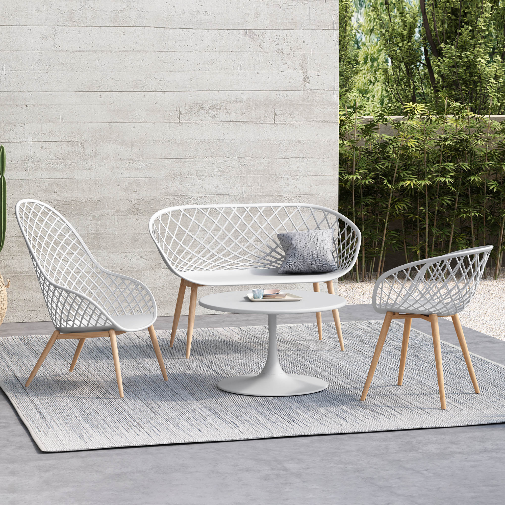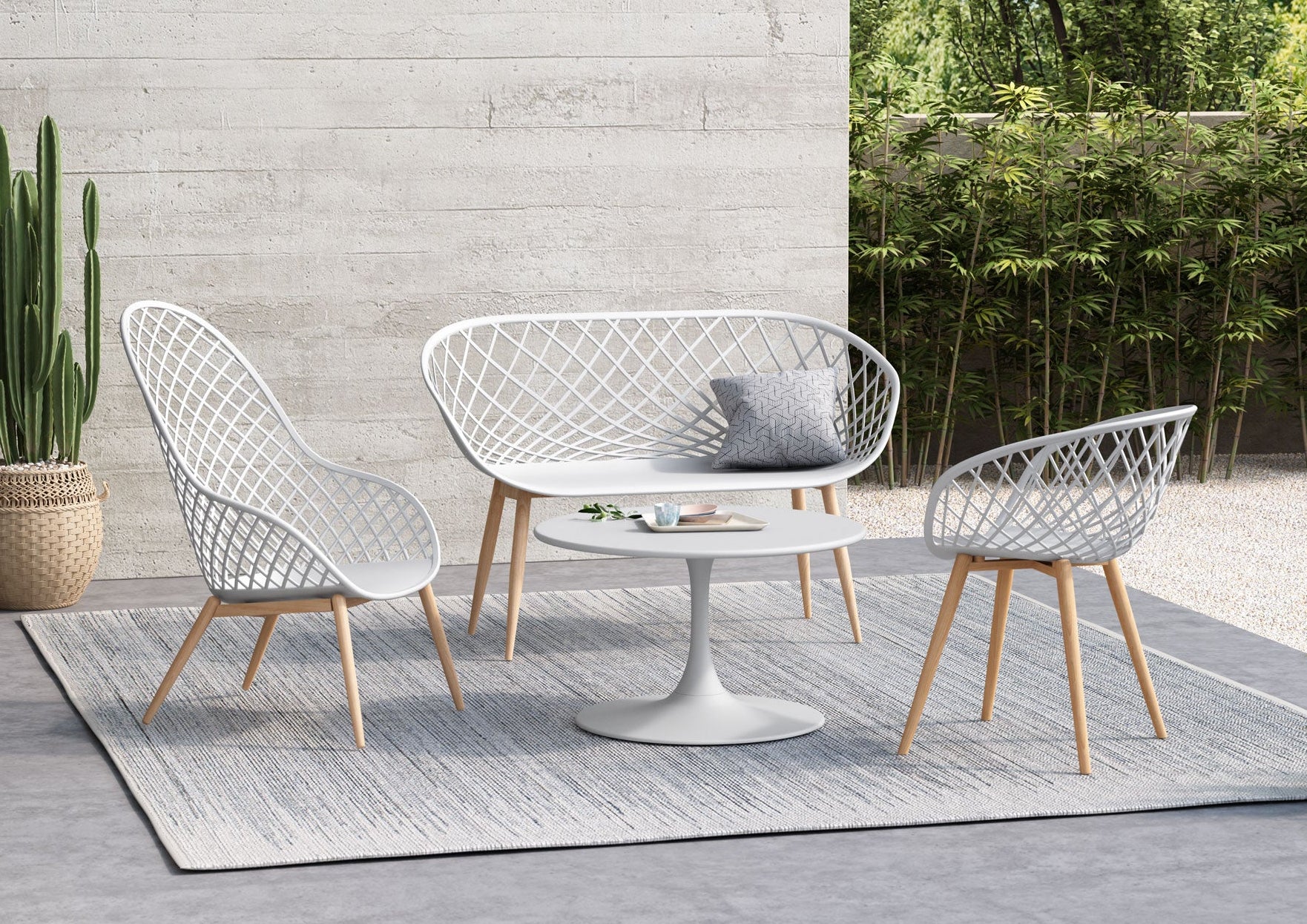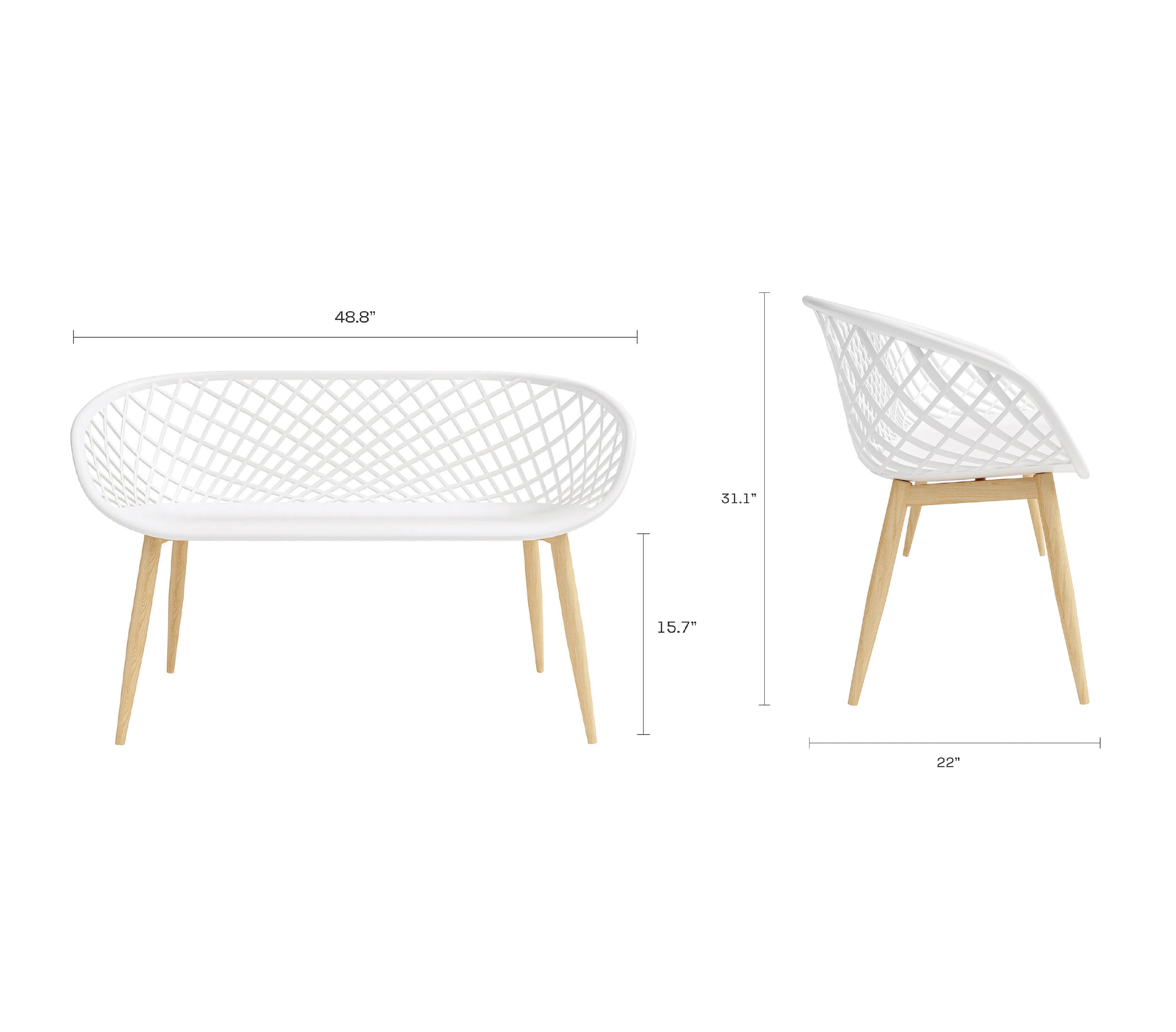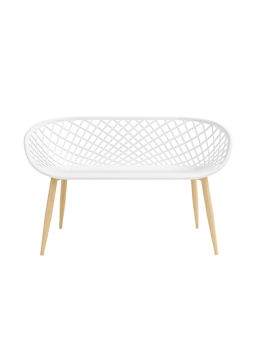 Who can resist the latest addition to the Kurv® Collection? The whimsical Kurv® Bench is a 2.5 seat version of the popular Kurv® Chair. Whether indoors or outdoors, the surprisingly roomy bench makes a splash in any setting. The Kurv® Bench, with our signature cross-hatch pattern is a refreshing seating choice for the deck, balcony, terrace or even poolside. Indoors, the bench immediately livens up the dining table, a breakfast nook, or entryway. The combination of the airy design with faux wood durable steel legs complements just about any space. The bench has ample room to add accent cushions and pillows. The contoured shape is ergonomically designed for comfort as well as style. Smooth, fade-resistant surfaces and steel frame are hard wearing and easy to clean. Minor assembly required.