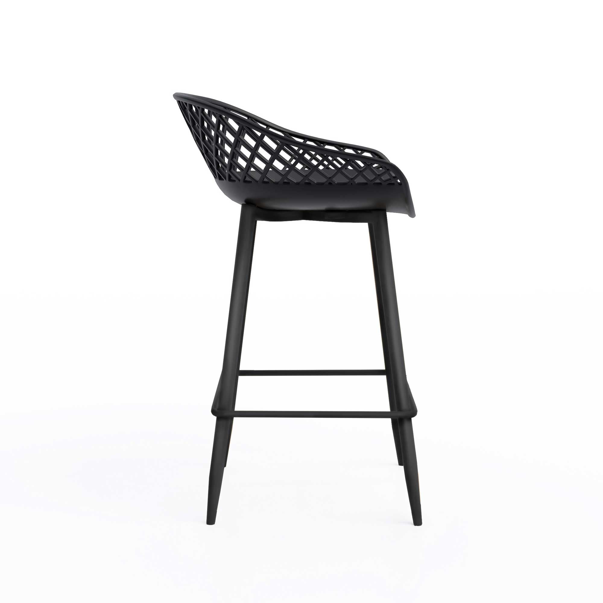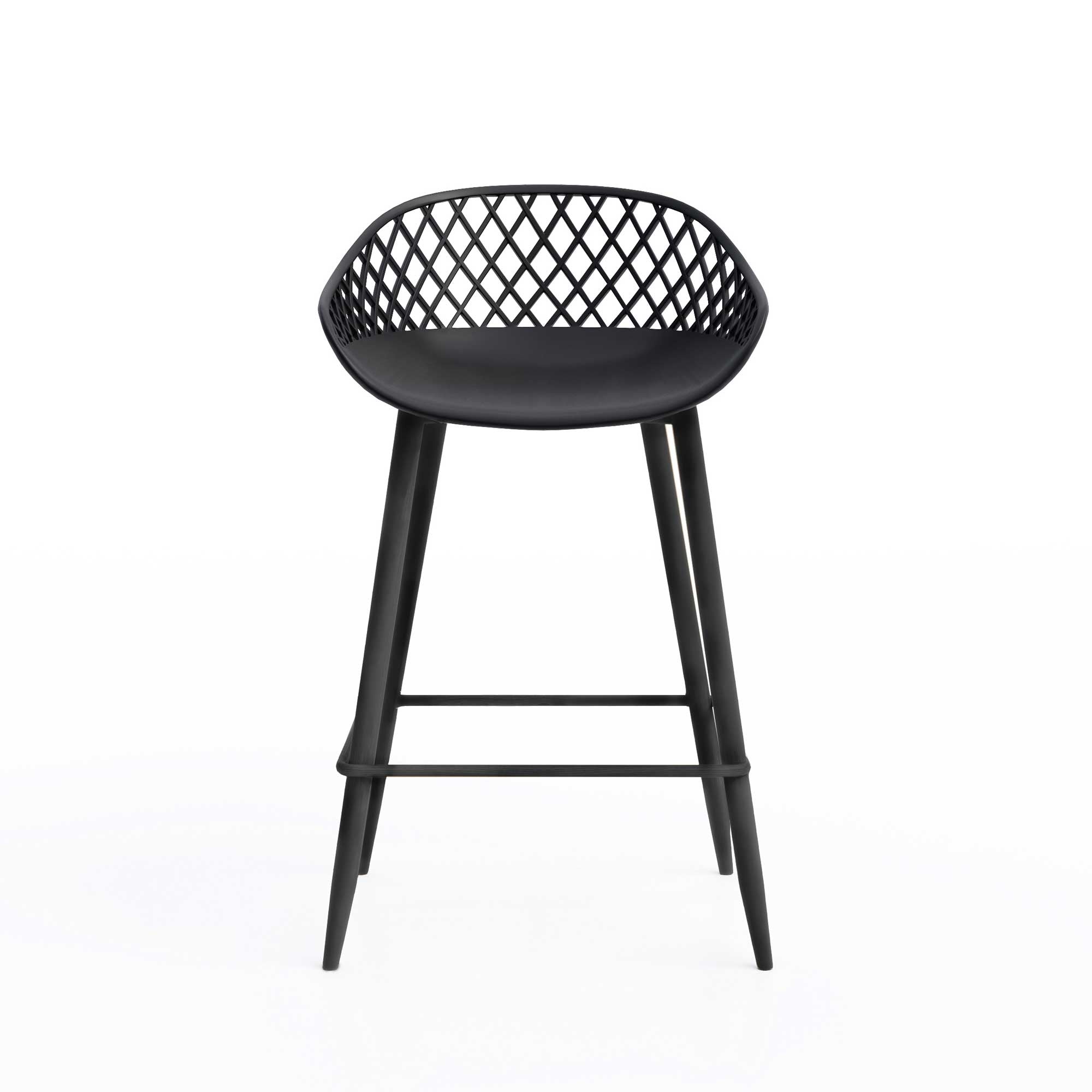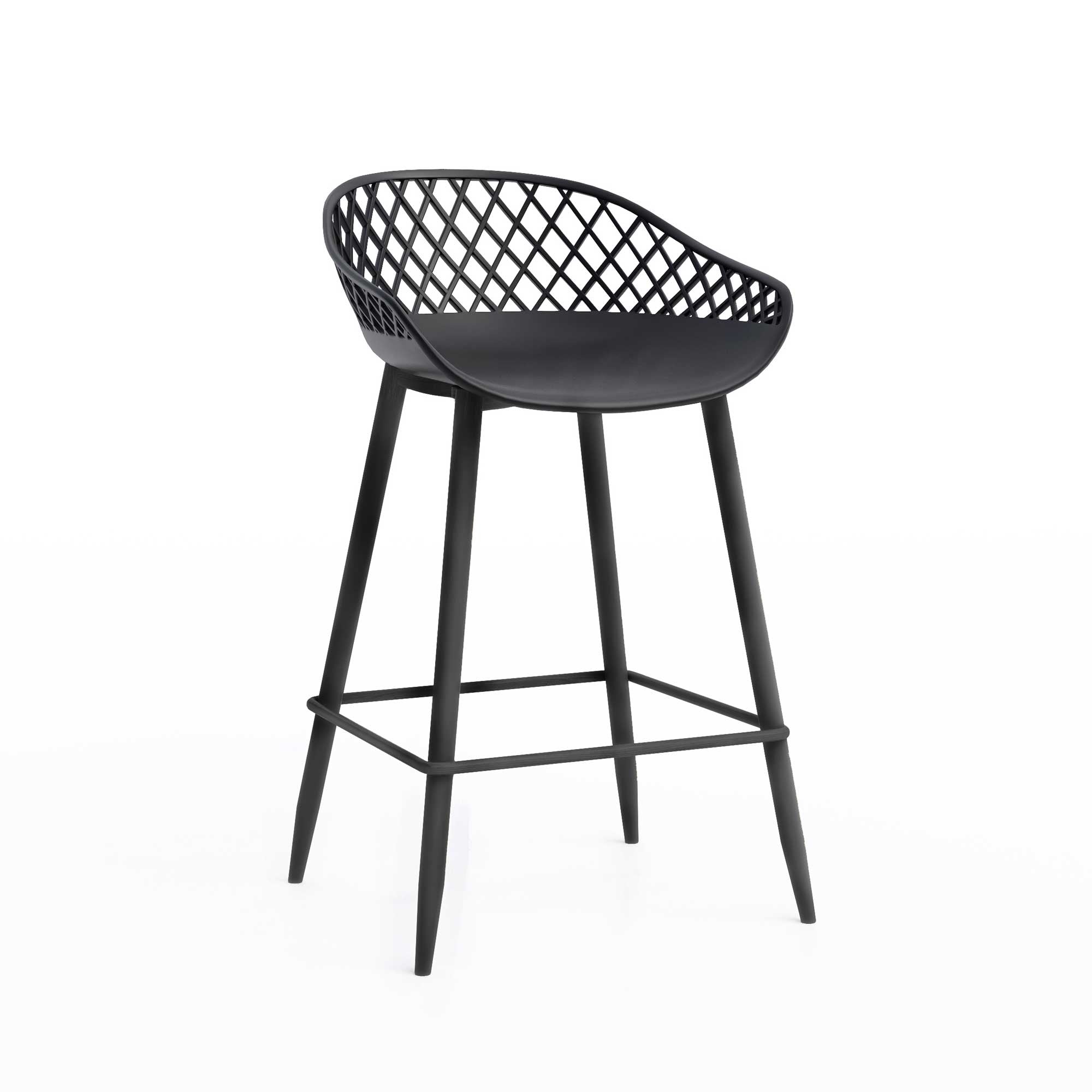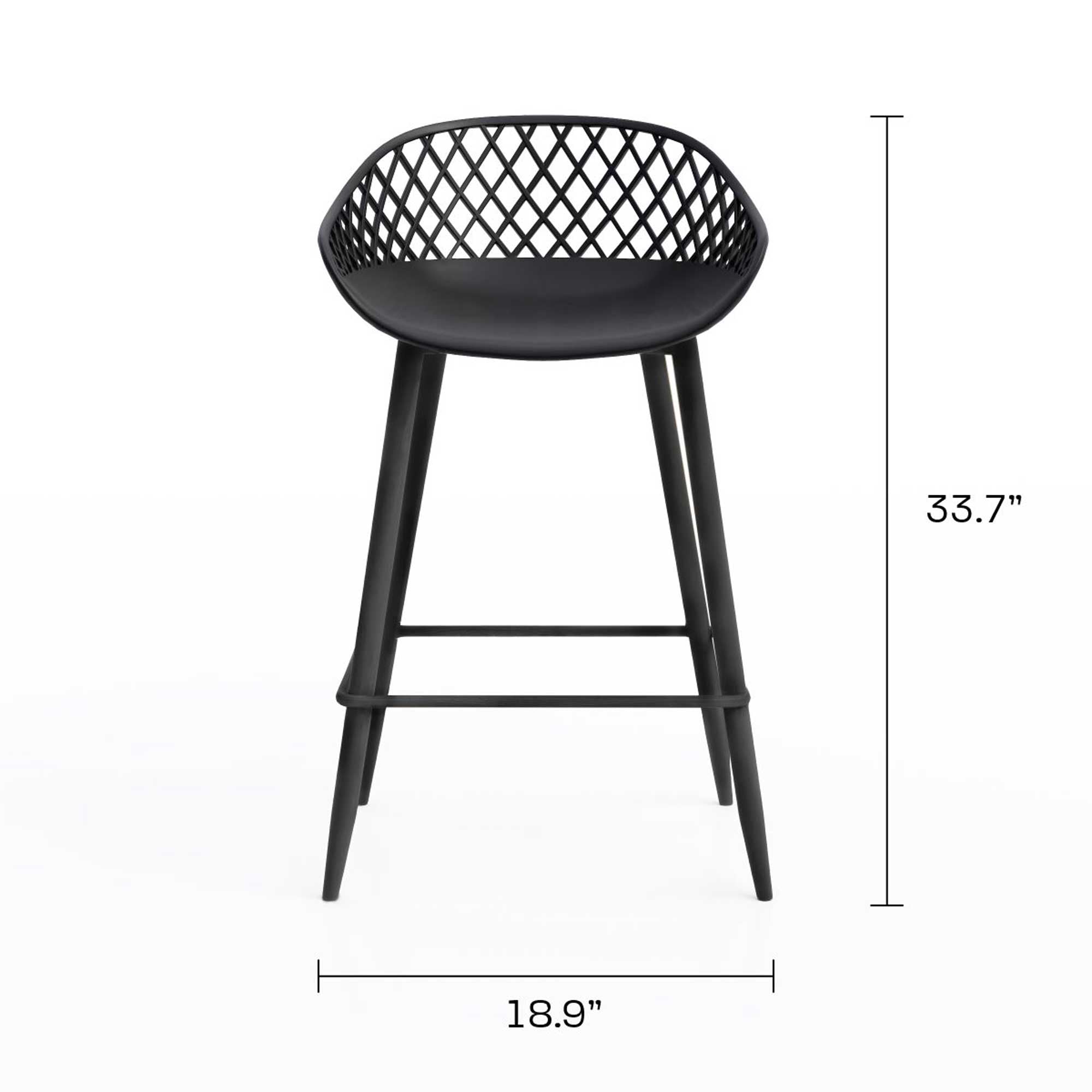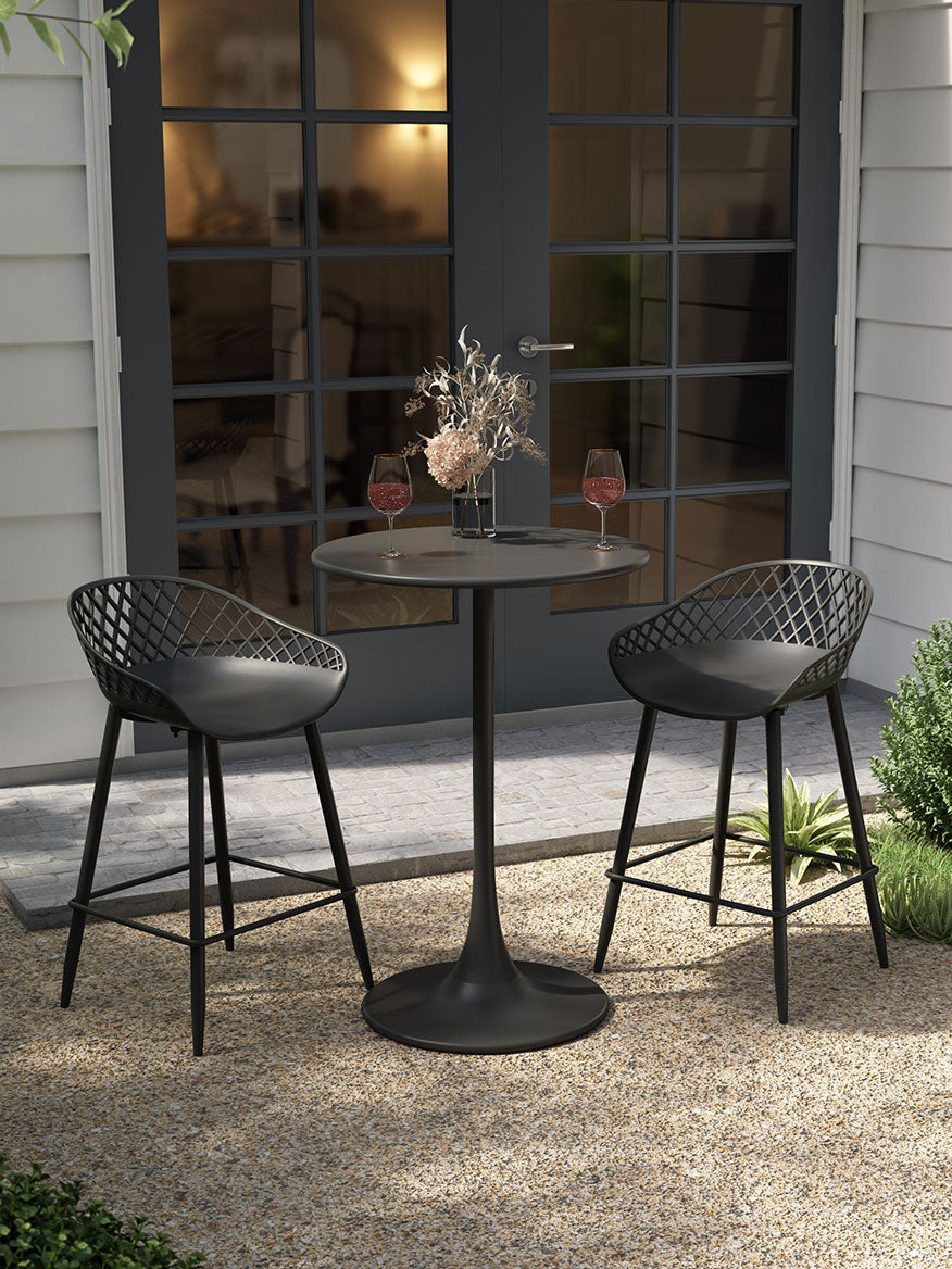 There's just something about the Kurv® 3-Piece Counter Height Bistro Set that adds an element of fun and lightheartedness to the surroundings. Designed for cozier urban spaces, there's so much more to the set than you'd think. Perfectly designed for even more space-saving, this 3-piece set is ready to go, indoors or outdoors. It's the ideal dining or cocktail table, but can also do double duty as a laptop station while you work from home. The minimalist, midcentury inspired design blends well in any setting, and can fit nicely in nooks with its single stem-and-base design. The table features a lightly textured finish and rounded edge top, and comes with a pair of Kurv® Counter Height Stools with the signature cross-hatch design. The contoured shape of the stools is ergonomically designed for comfort as well as style. All surfaces are easy to clean and the set is weatherproof. Table measures 24"D x 36"H, chair measures 18.7"W x 33.7"H. Minor assembly required.