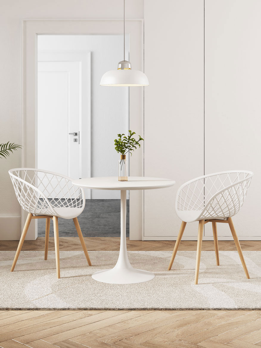 Small space living just got more chic with this Kurv® 3-Piece Dining Set. Designed for cozier urban spaces, the set is perfect as a dining table or in a breakfast nook, or instantly create a work from home space. The minimalist, midcentury inspired design blends well in any setting, and can fit nicely in nooks. The table top features a white high gloss finish and beveled edge, with white stem and base. A pair of white KurvTM Arm Chairs with the signature cross-hatch design completes the set. The contoured shape of the chairs is ergonomically designed for comfort as well as style. All surfaces are easy to clean. Table measures 24"D x 29.5"H, chair measures 18.7"W x 32.5"H and seat is 18"H. Minor assembly required.