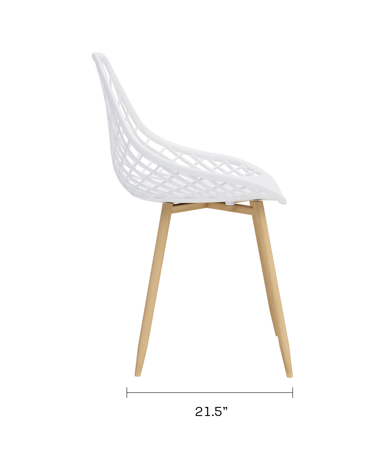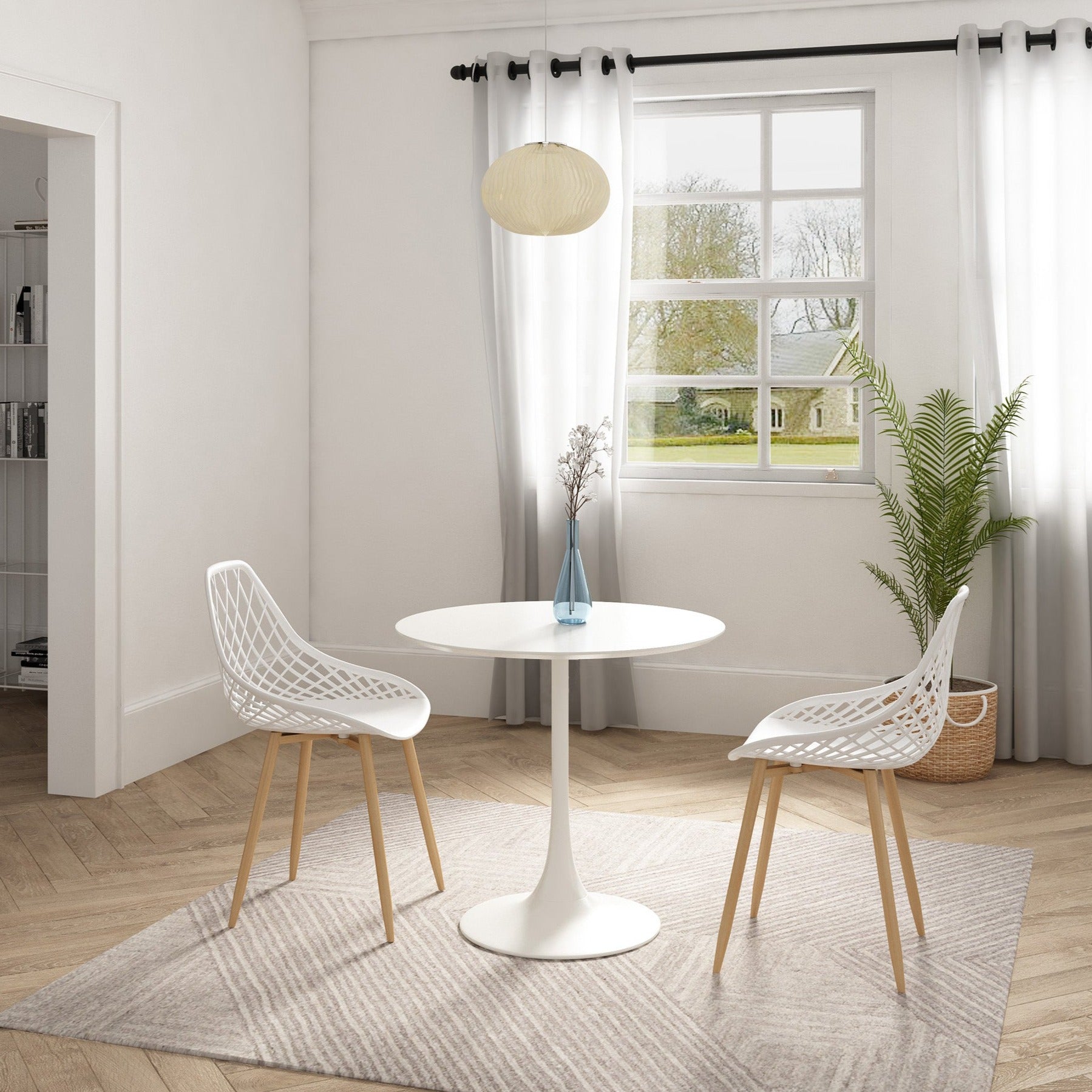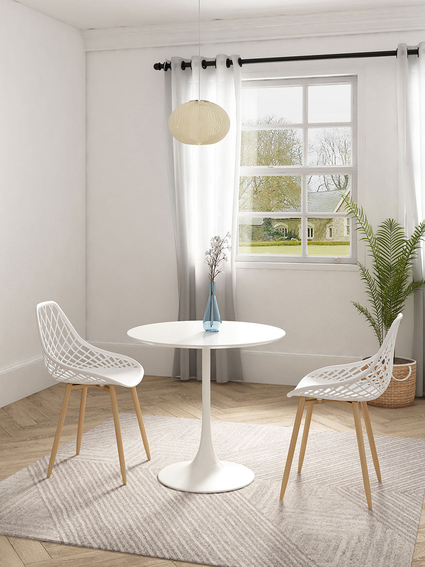 Thoughtfully designed for kitchen nooks, cozy dining rooms, or even a home office, the Kurv® Cafe Set is a staple in every modern space. The versatile trio is ready made to brighten up and modernize your space with a midcentury inspired aesthetic. The timeless design blends well in any setting, and can fit nicely in nooks with the round table top design. Add additional chairs to seat a party of four comfortably. Or create a chic workspace that's great for meetings and conferencing. The unique ergonomic shape of the Kurv® Dining Chair is comfortable and as a bonus, is designed for use both indoors and outdoors with its ultra durable and fade resistant surfaces. The unique abstract pattern is a refreshing seating choice for the deck, balcony, terrace or even poolside. Smooth surfaces of the chairs are hard wearing and the high gloss finish and beveled design of the table top is easy to clean. Minor assembly required.