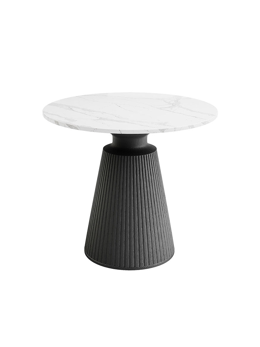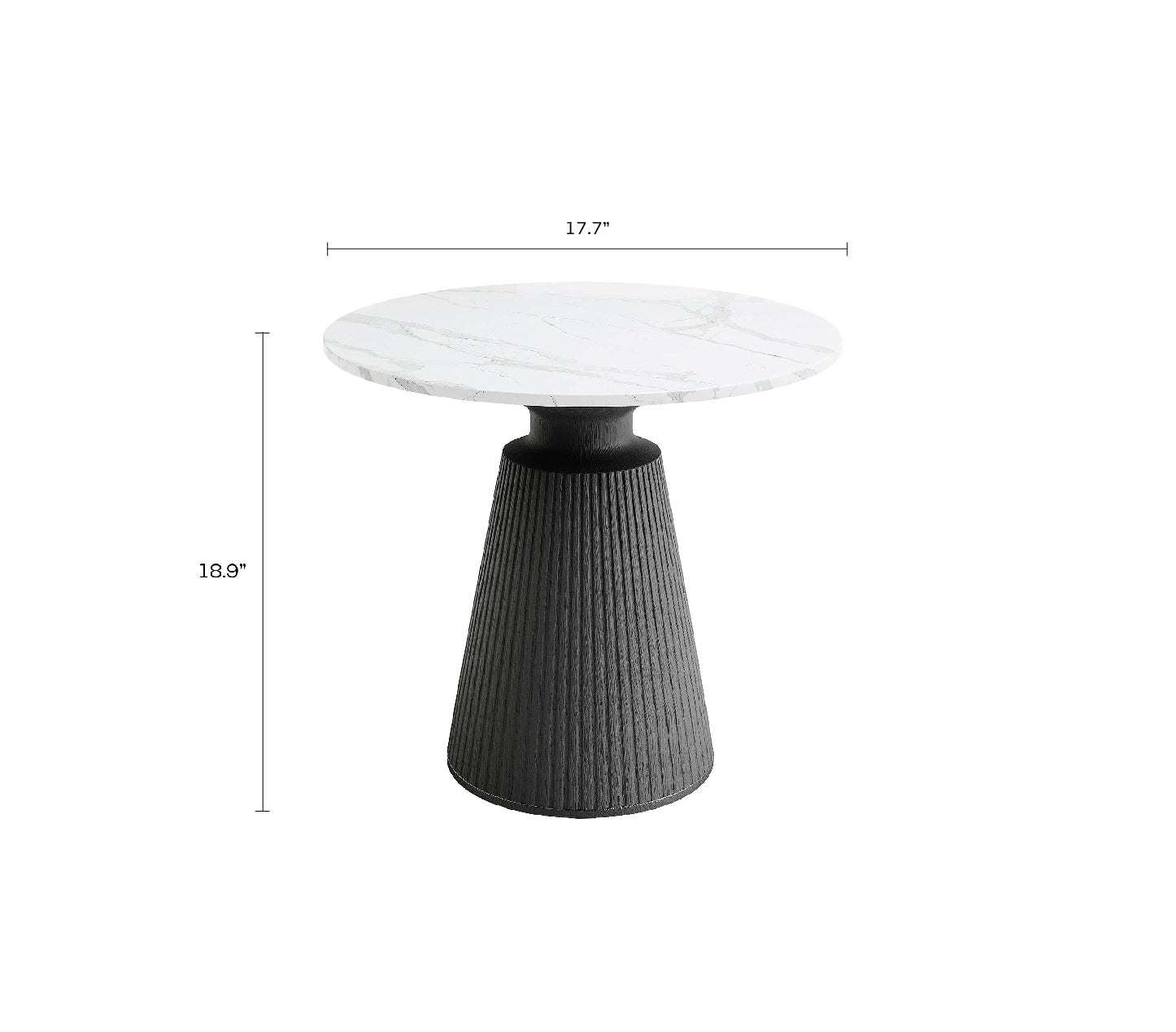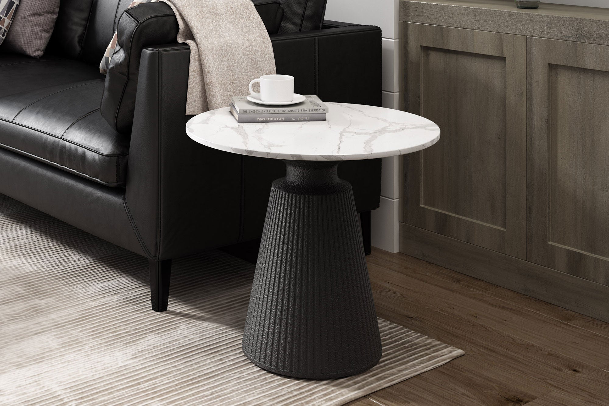 Add a touch of glamour to your home or office design with the Leda Side Table. Featuring a stylish faux white marble table top and black fluted base, the table lends a dramatic element to the space. Designed for today’s modern lifestyle, the table is made for both indoors and outdoors, and is the ideal piece to accompany a sofa, armchair, bed, or patio furniture. The compact footprint is perfect for small spaces. Lightweight, weatherproof, and made of a durable molded clay fiber. Easy to clean surfaces. No assembly required. Measures 17.7”W x 17.7”D x 18.9”H. Base diameter is 12”W.